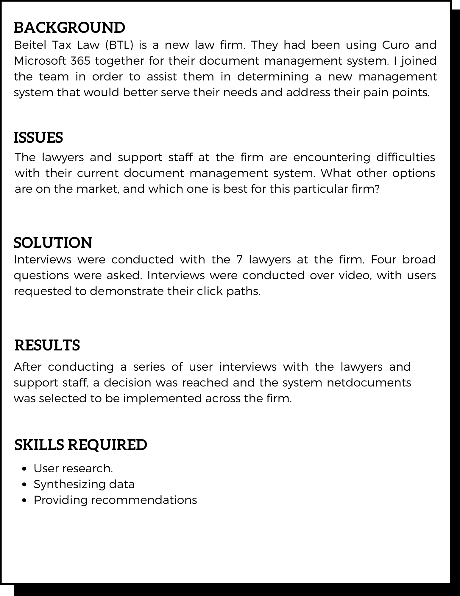 TL; DR: User research methods were used to determine the best document management system for the law firm.